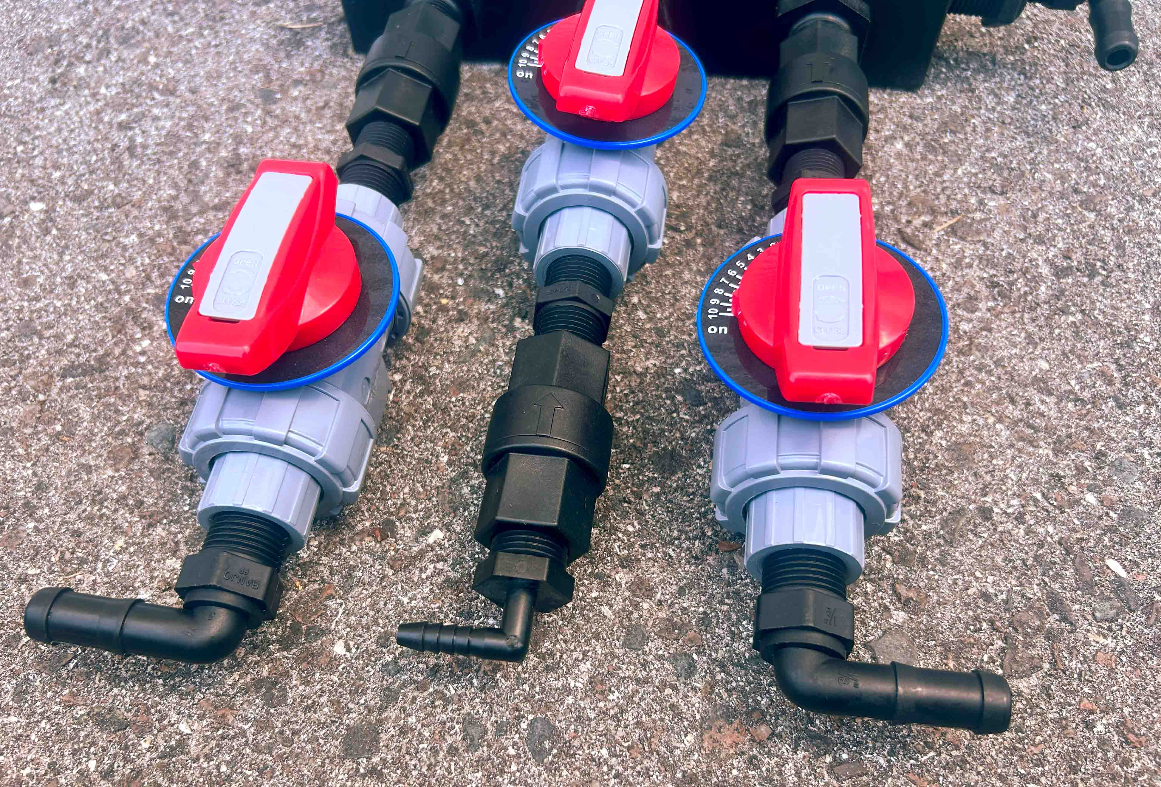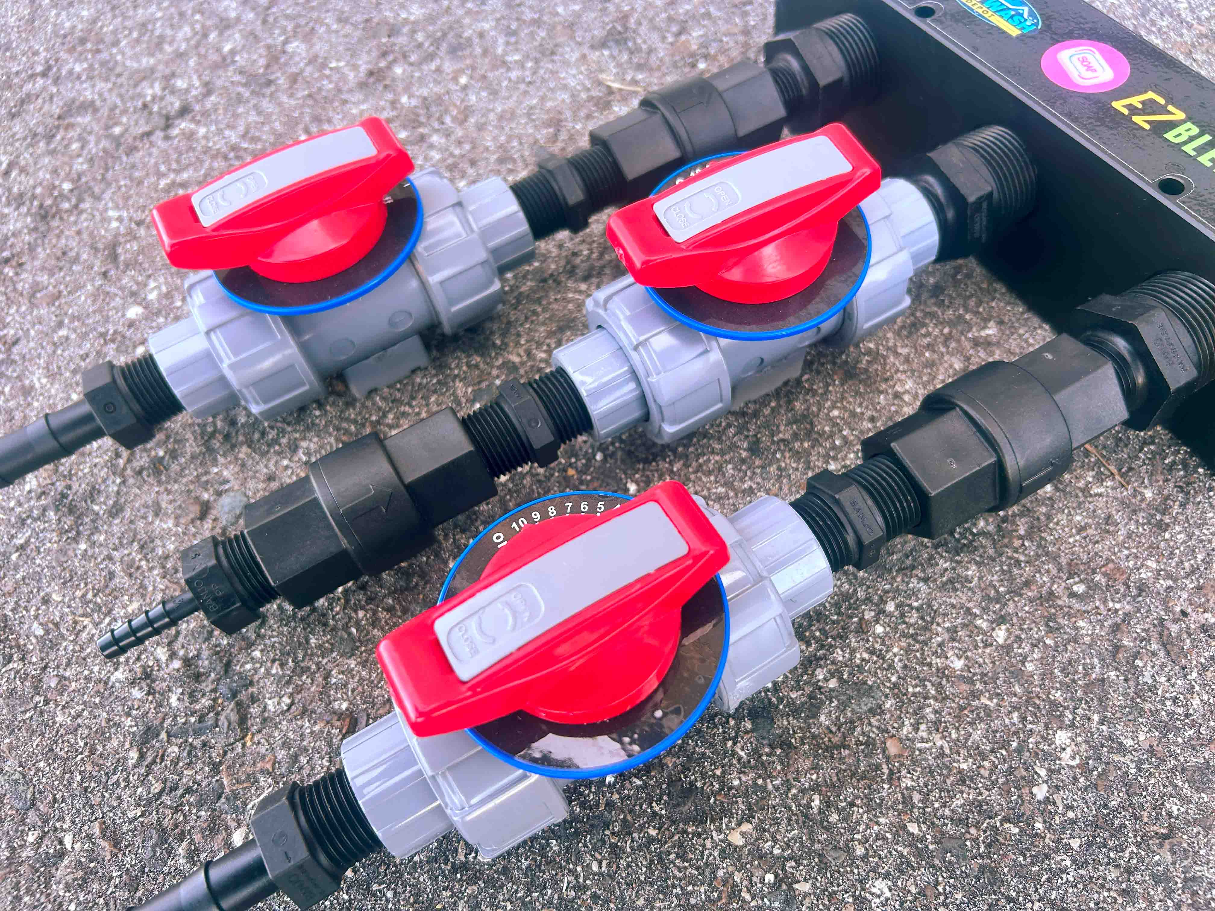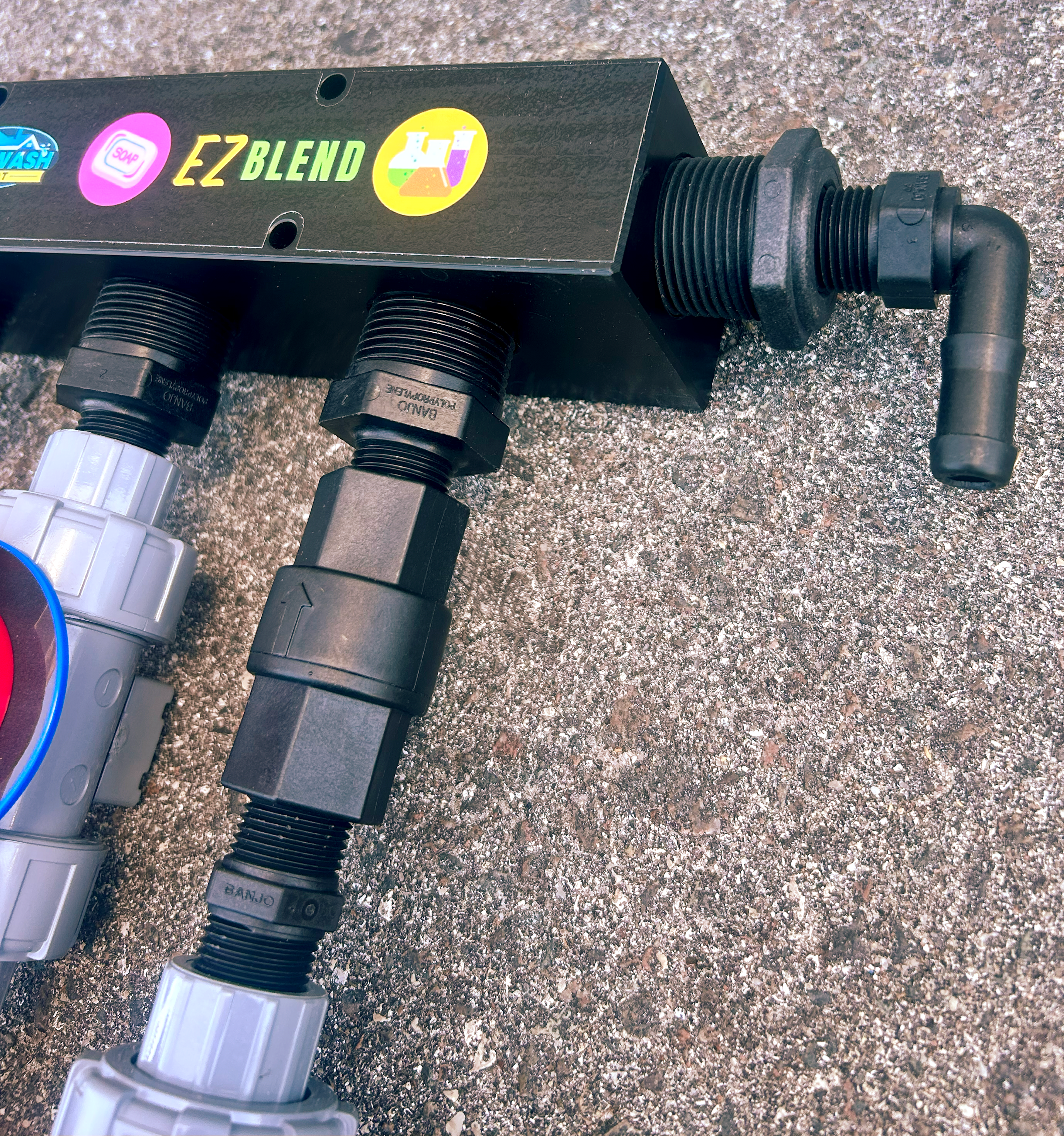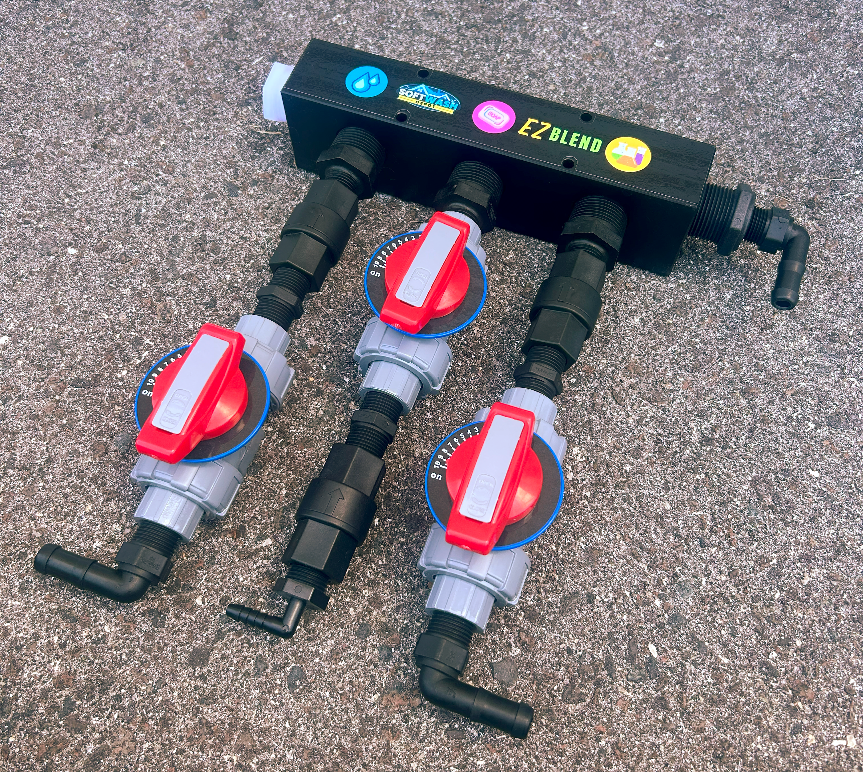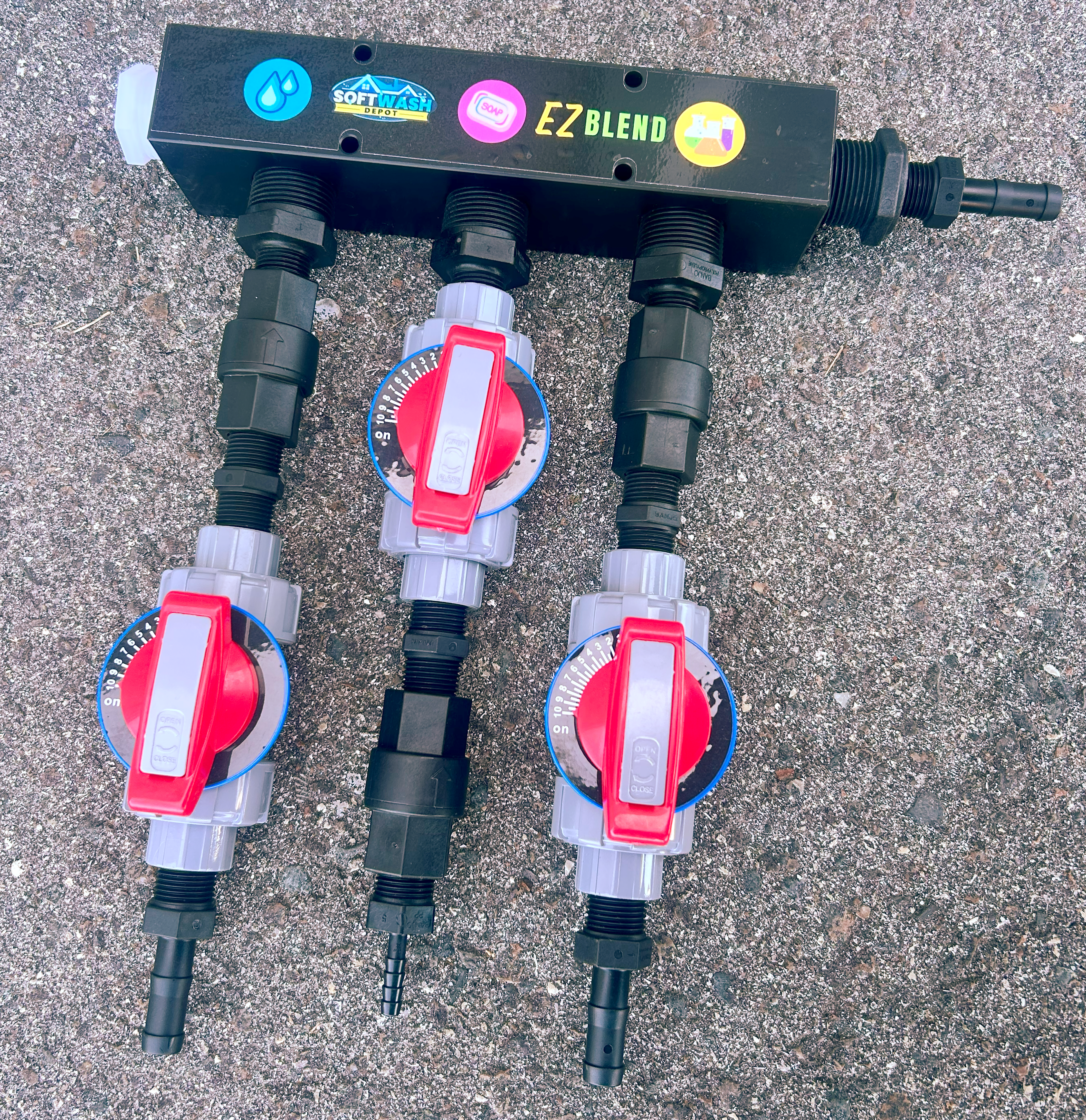 Mixing System with EZ Blend Mounting Block and three (3) 1/2in Softwash Technologies valves. Also available with 90° barbs.